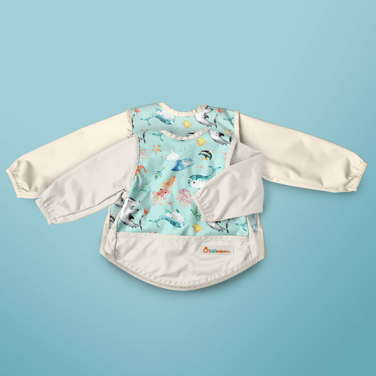 The Smocket is a full-sleeve bib (a.k.a smock) with a crumb catcher on the front (or pocket). It is designed to hold all the mess your kid can throw at it, which means less crap for you to deal with.