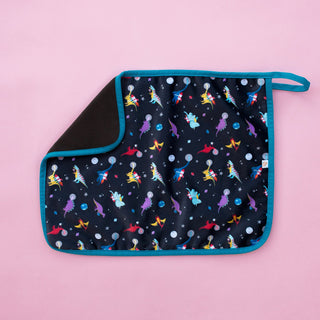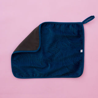 It’s simple—just flip it around! The bib snaps both ways. If your little one is teething and drooling, turn the fleece side out to absorb all that moisture. For mealtime messes, turn the PUL (print) side out to wipe away the food with ease.