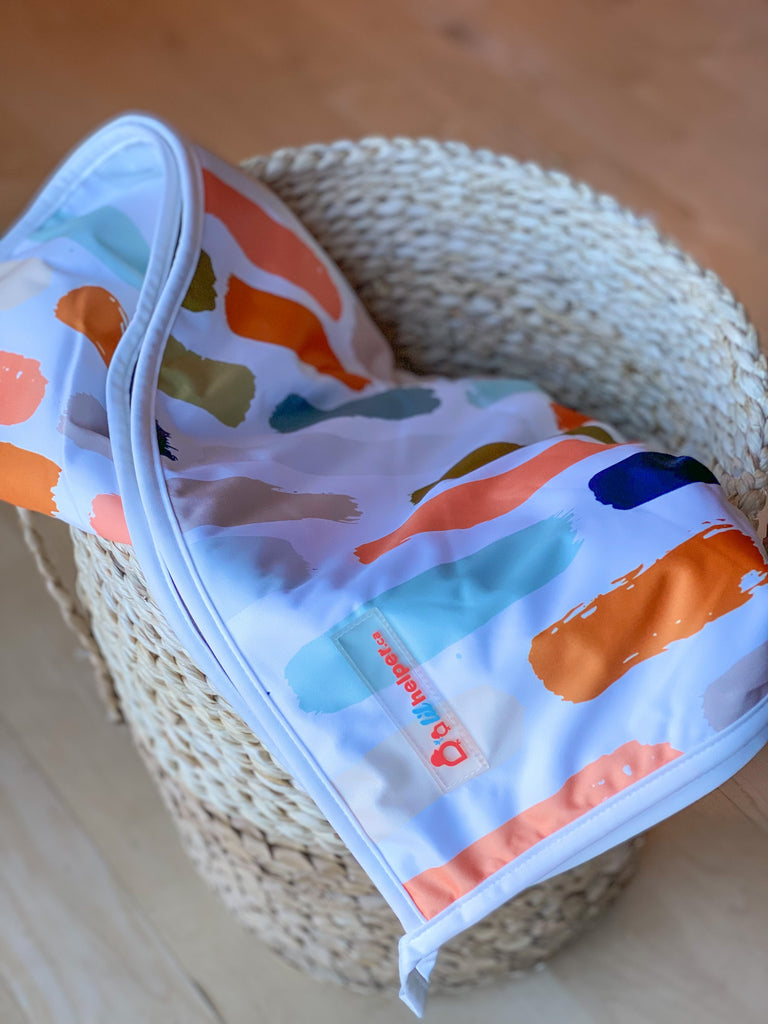 Lil Helper will guarantee workmanship and materials in a properly cared for product for one year from the date of purchase. Our warranty covers all components of our products including the snaps, lining, elastic and waterproofing.