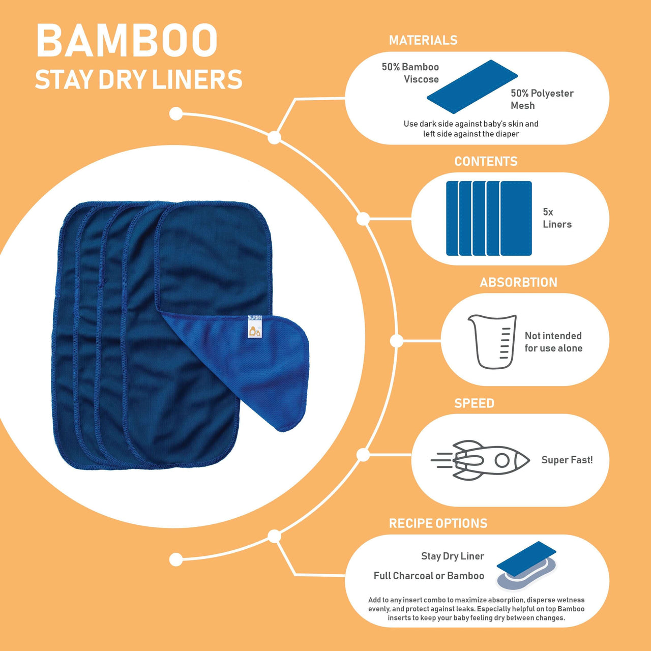 Made from a blend of 50% bamboo viscose and 50% wicking polyester mesh, these liners are soft, breathable, and gentle on delicate skin. Bamboo’s natural deodorizing, antibacterial, and hypoallergenic properties keep things fresh while wicking moisture away to keep your little one comfy and dry.