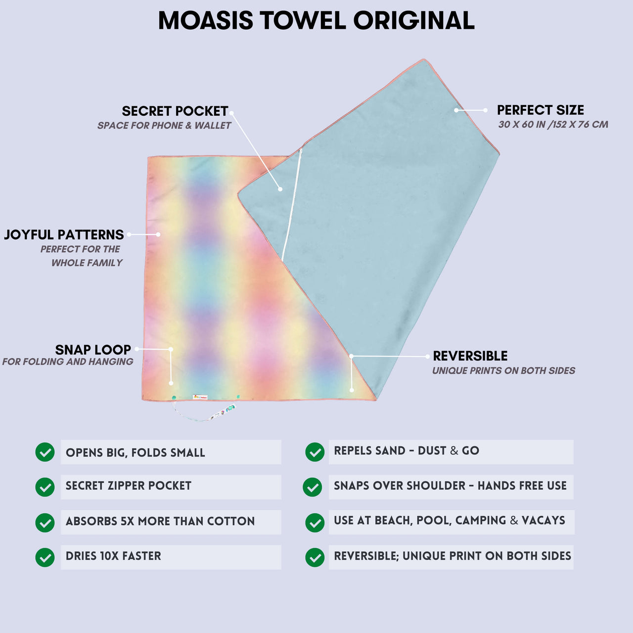 The Moasis towel is big on coverage but low on bulk. Lightweight and compact, it folds down to the size of a soda can and weighs even less. Perfect for beach days, hikes, travel, and everything in between—without making you feel like you’re hauling gear for a Himalayan trek. Plus, it comes with a built-in snap and strap, so packing up is always easy breezy.