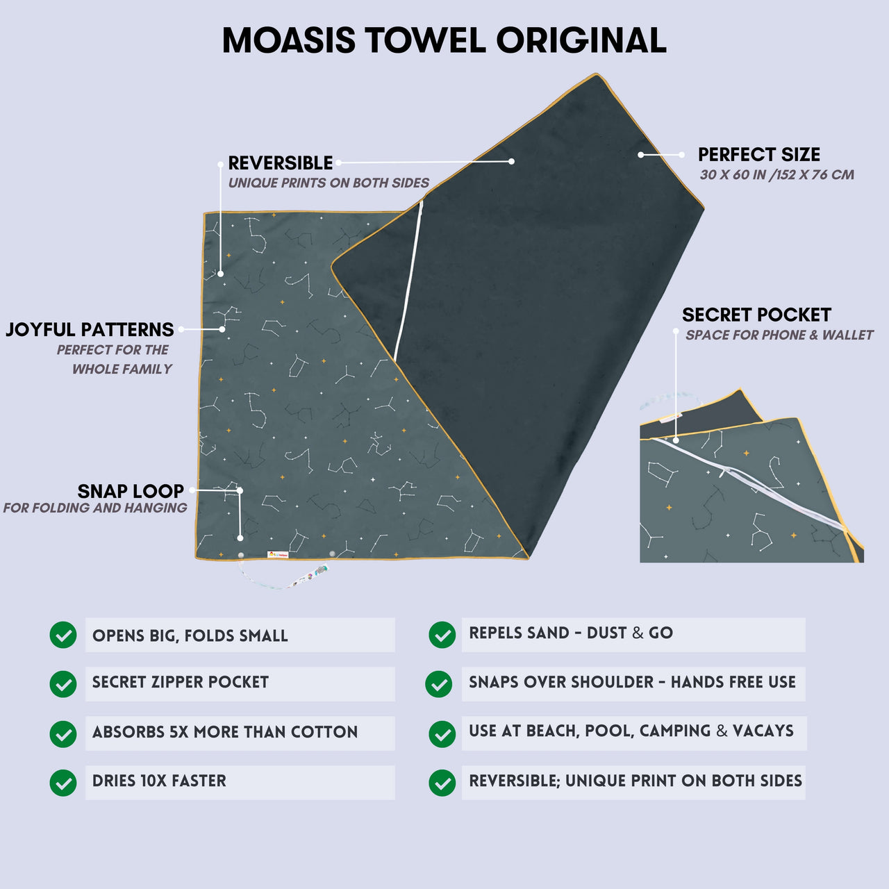 This clever feature was inspired by one of our brilliant ambassadors—a multitasking outdoors lover who needed a hands-free way to carry the essentials. We took that idea and ran with it—adding a built-in pocket to the Moasis towel. It’s the perfect spot to stash your keys, sunscreen, or whatever else you need to keep close while you’re out living your best sun-soaked life.