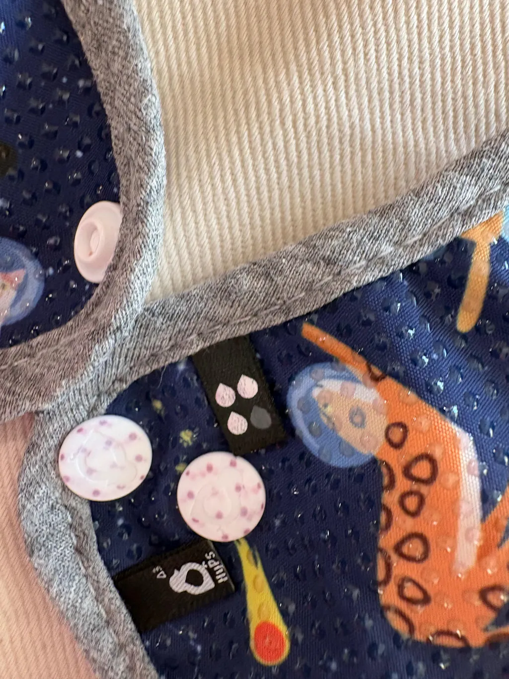It’s the blue, non-printed side. This blue, non-printed top layer that touches your vulva is made of our bamboo stay-dry wicking material, which pulls moisture away and washes clean easily.
