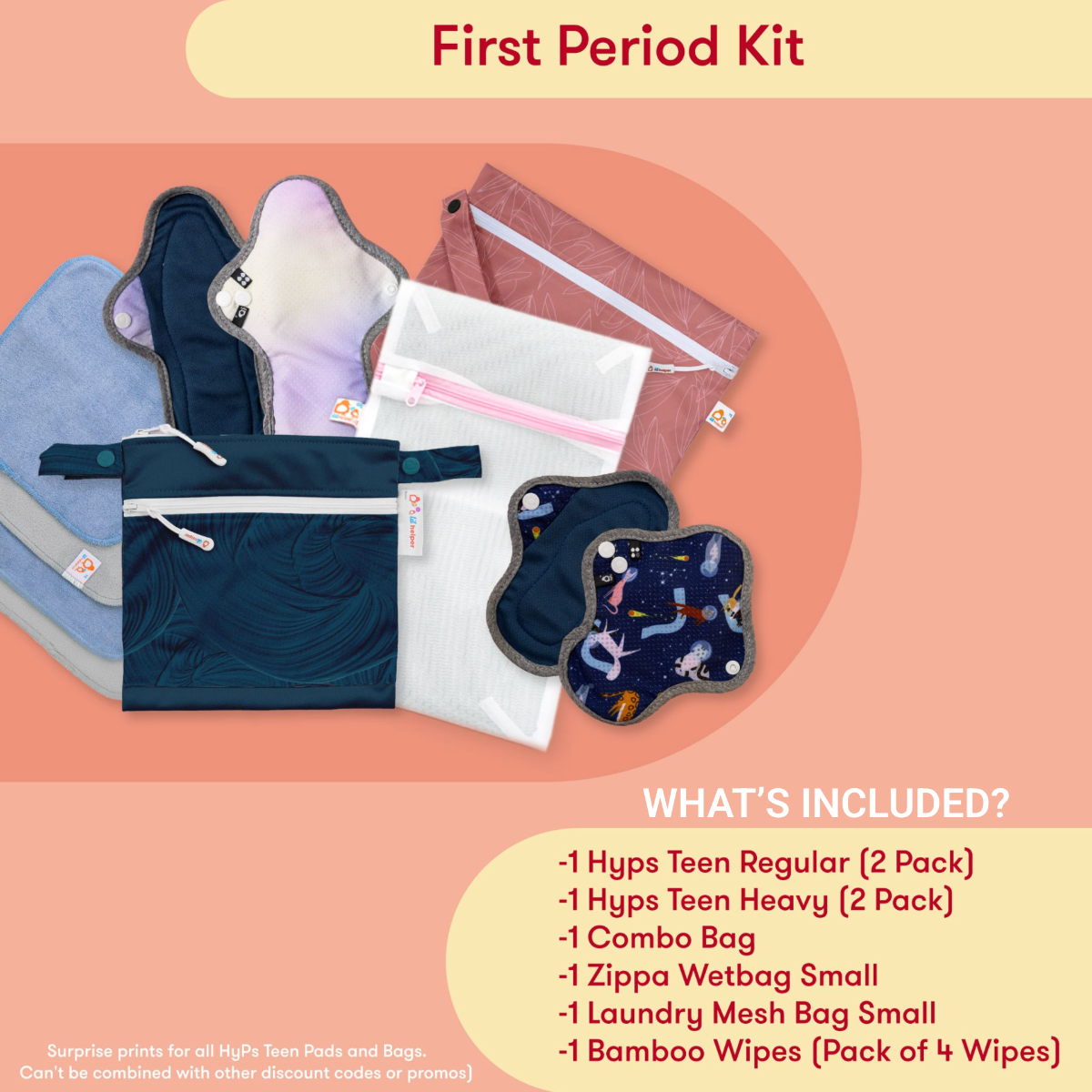 This complete kit includes a set of HyPs Teen pads for both regular and heavy flow, a convenient combo bag, a zipper wetbag for on-the-go protection, a small laundry mesh bag, and a pack of four bamboo wipes. All pads and the combo bag come in fun surprise prints to make the experience enjoyable and personalized.
